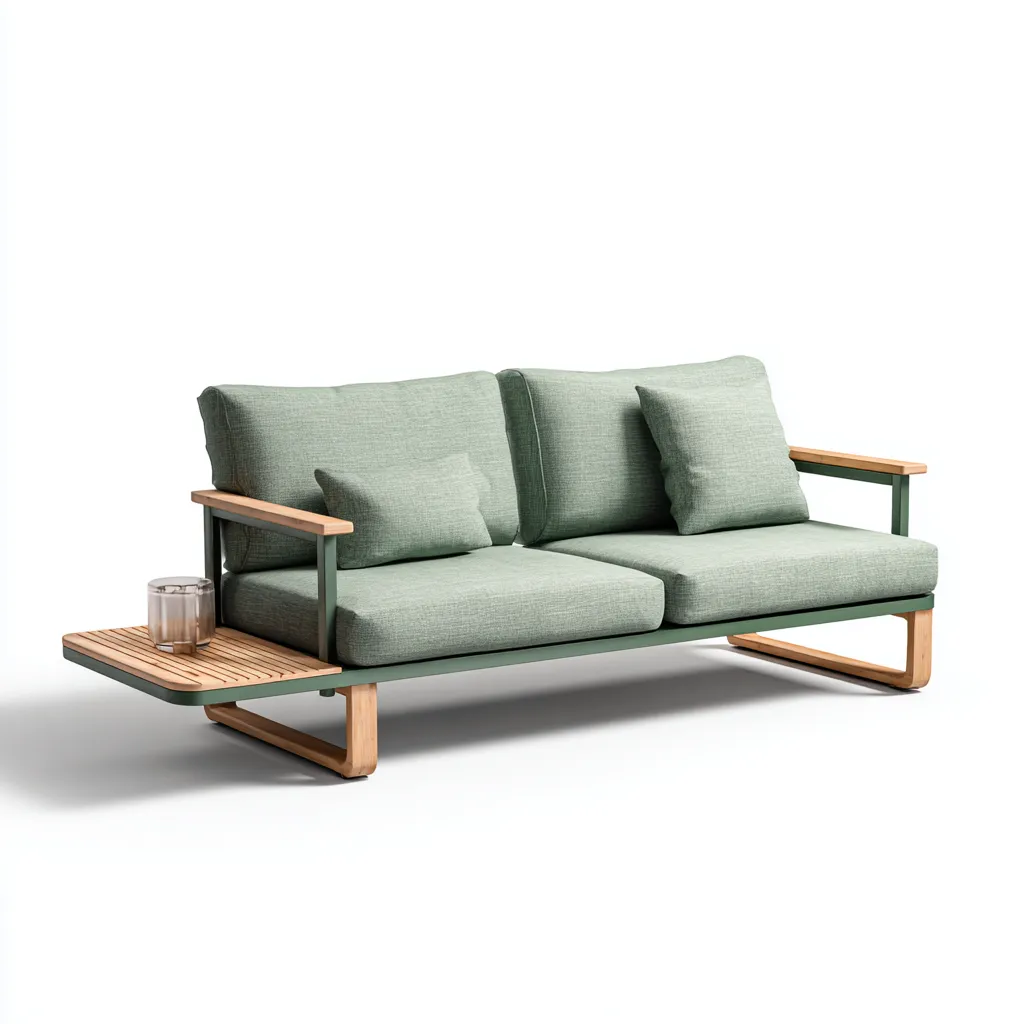 Questo divano da esterno a due posti presenta un design moderno che combina comfort e funzionalità. La struttura in metallo con finitura verde e gli eleganti elementi in legno offrono un aspetto naturale e raffinato, ideale per terrazze, balconi e giardini.