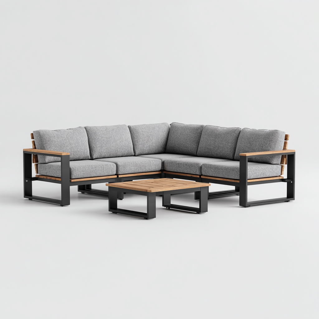 Questo set di divani da esterno angolare unisce una robusta struttura in metallo con dettagli in legno, creando uno stile moderno ideale per spazi all'aperto come giardini e terrazze. I cuscini in tessuto grigio offrono una seduta confortevole e adatta ai momenti di relax.