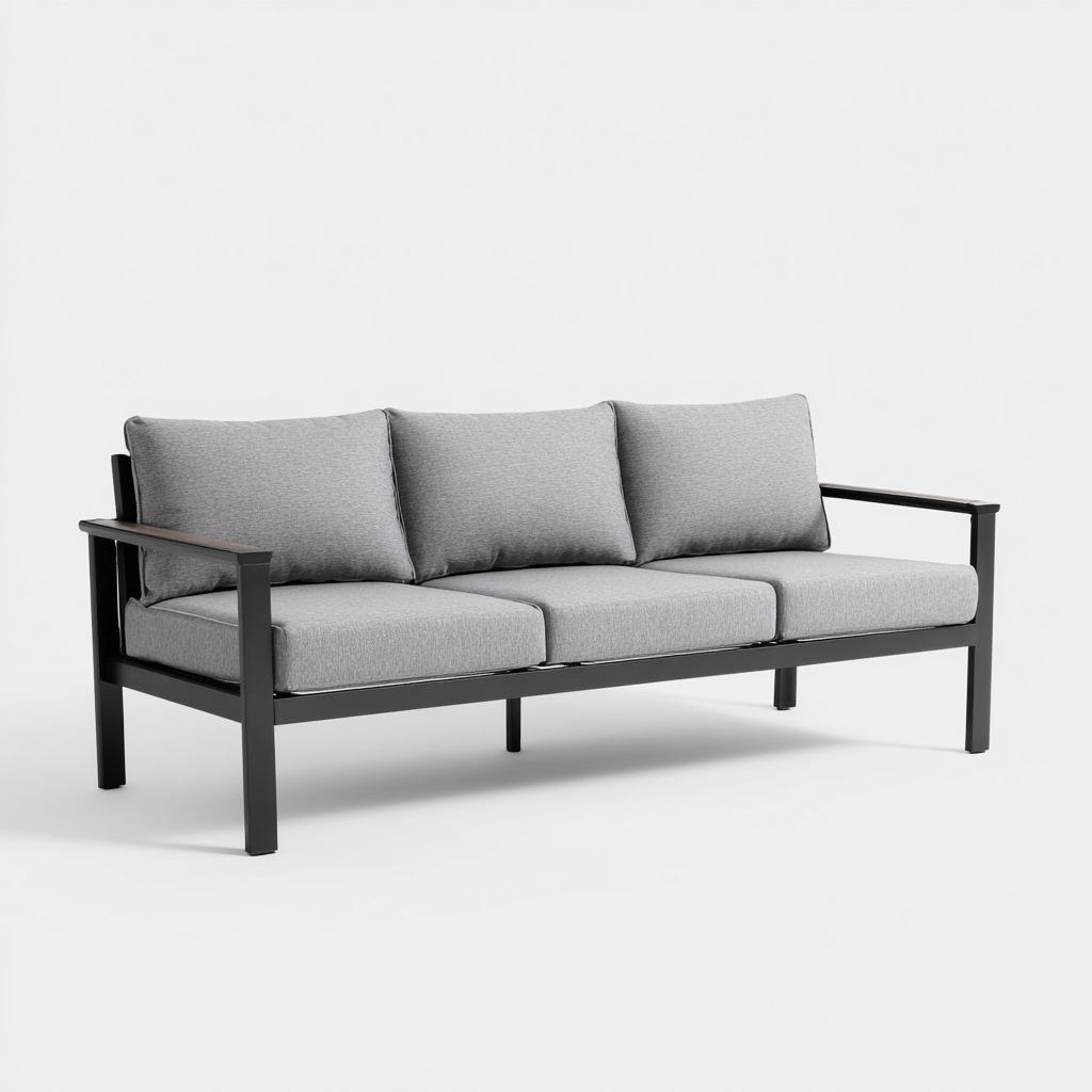 Questo divano da esterno a tre posti con struttura in metallo offre uno stile moderno e funzionale, ideale per giardini, terrazze e zone relax all'aperto. I cuscini in tessuto grigio garantiscono un comfort piacevole per momenti di riposo all'aperto.