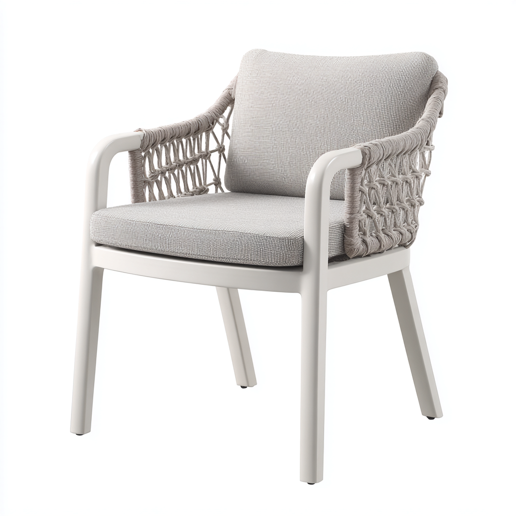 La struttura in metallo assicura stabilità mentre i lati in corda intrecciata aggiungono un tocco artigianale. I cuscini rivestiti in tessuto grigio chiaro sono progettati per affrontare l'uso esterno e mantenere una seduta confortevole.